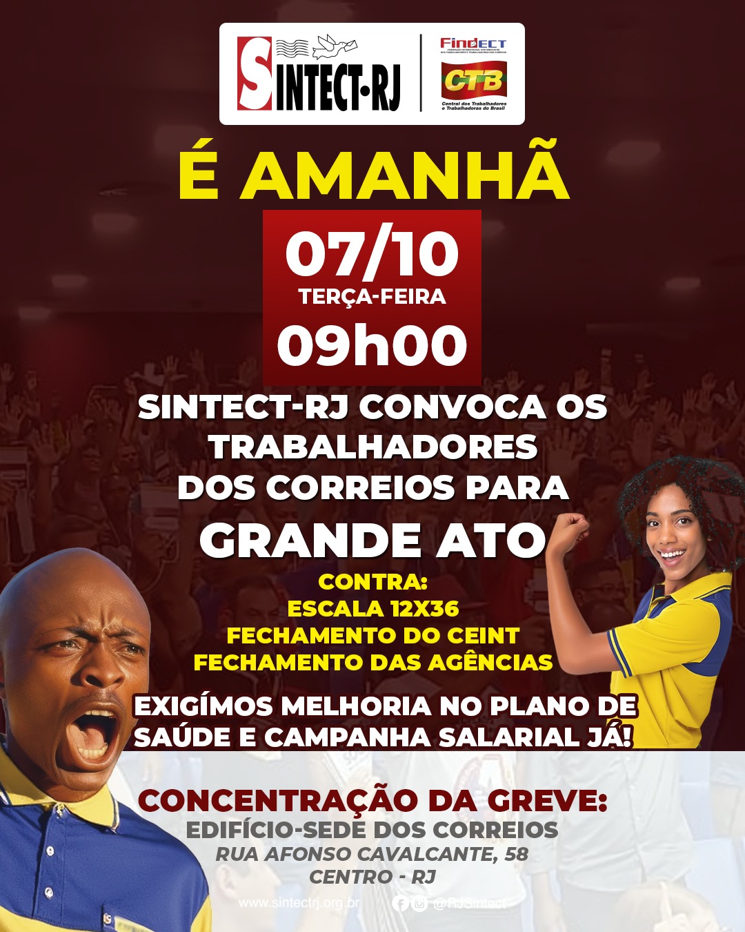 O presidente do Sintect-RJ, Marcos Sant’aguida, convocou neste sábado (4), os trabalhadores e trabalhadoras dos Correios para a greve de 24 horas, na próxima terça-feira (7), com concentração na porta do edifício-sede do Rio de Janeiro, na Avenida Presidente Vargas, no Centro do Rio, às 9h.