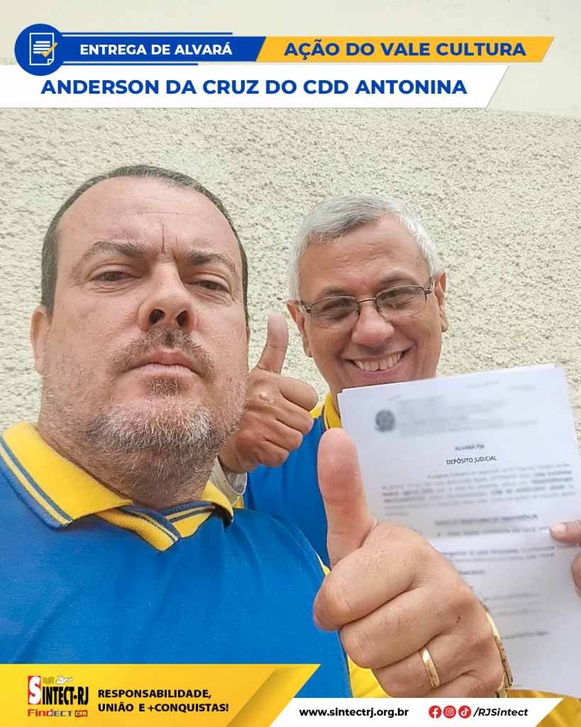 MAIS UMA CONQUISTA DO SINTECT-RJ: TRABALHADOR do CDD ANTONINA RECEBE ALVARÁ DA AÇÃO do Vale Cultura